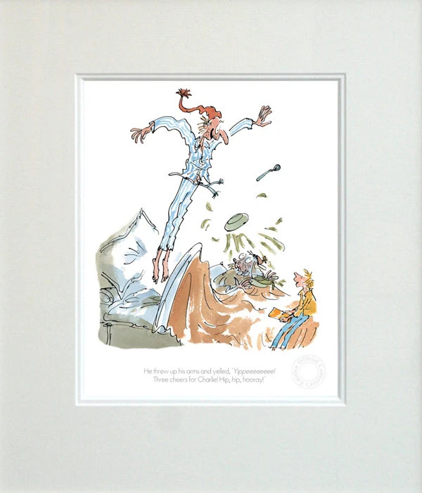 'Three Cheers for Charlie!' is an Official Collector's Edition Print of 595 from the classic book 'Charlie and the Chocolate Factory' written by Roald Dahl and illustrated by Quentin Blake.